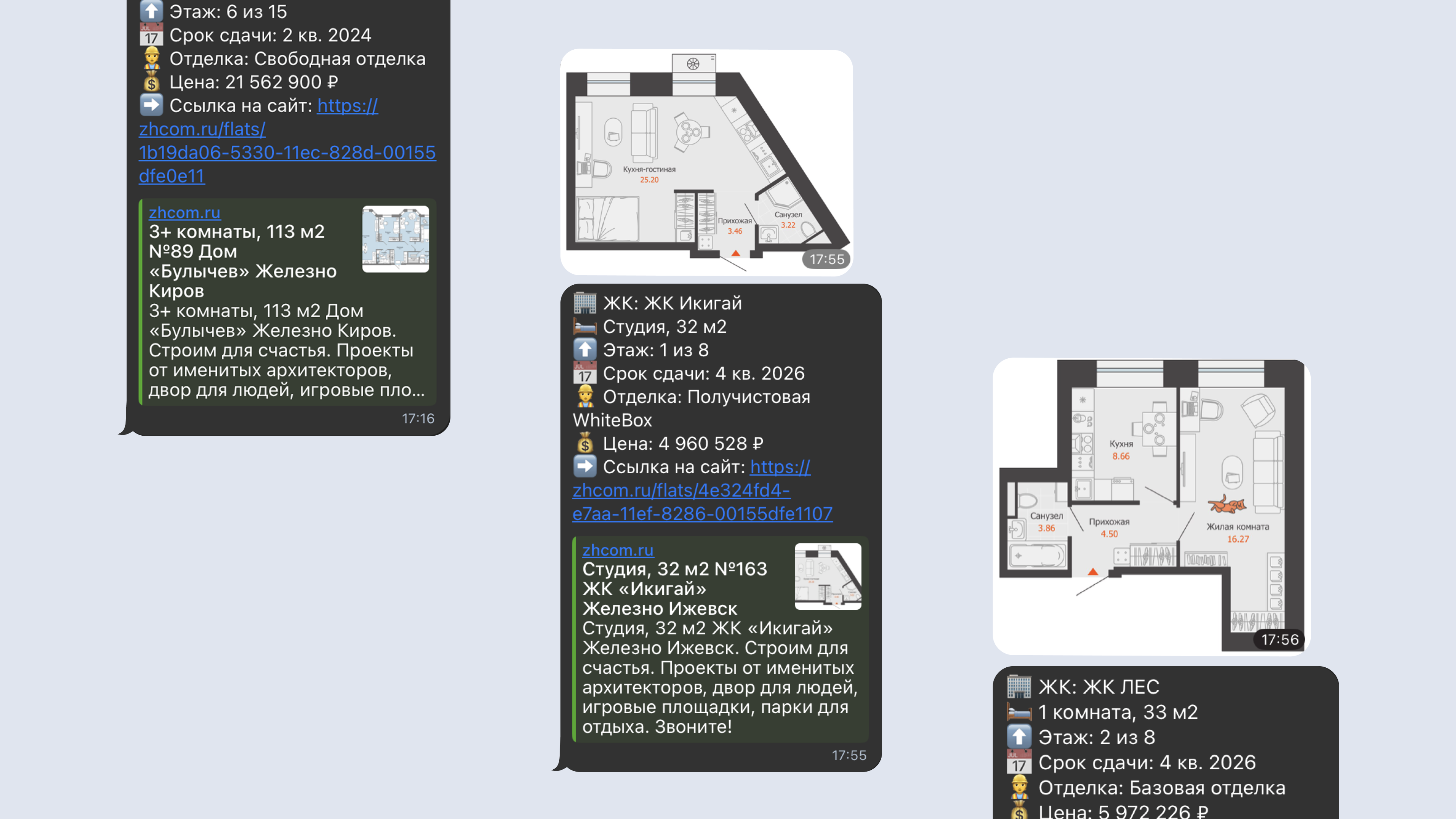 После выбора параметров бот показывает конкретные квартиры в удобном формате. Каждая карточка содержит планировку, этаж, площадь, срок сдачи, стоимость и ссылку на сайт застройщика. Информация подаётся наглядно и структурировано, поэтому легко сравнивать и сразу понимать, какие варианты подходят лучше. Такой подход экономит время и позволяет быстрее найти идеальную квартиру.